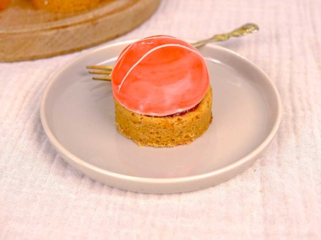 Kleine ronde slof gemaakt van rijk boterdeeg gevuld met een combinatie van amandelspijs en room, opgespoten met luchtige bavaroise in de smaak aardbei.